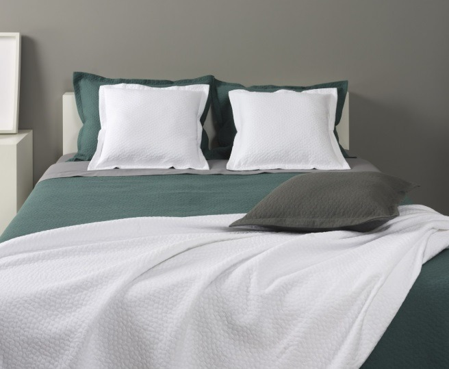 La colcha portuguesa LAZIO tiene un diseño sencillo y geométrico. Está disponible en cuatro tonos: blanco, azul-verdoso, burdeos y gris.