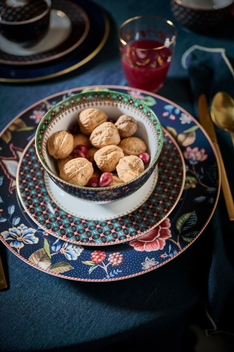 Nuestro cuenco Berry blues tiene un aspecto muy cálido y elegante, gracias a sus oscuros colores en tonos azul y verde. El cuenco está decorado con un diseño floral azul oscuro con ramas en las que crecen elegantes flores de fantasía y bayas. Los bordes están rematados con detalles dorados y una sorprendente franja roja y blanca, lo que confiere al cuenco Berry Blues un aspecto aún más cálido y acogedor.